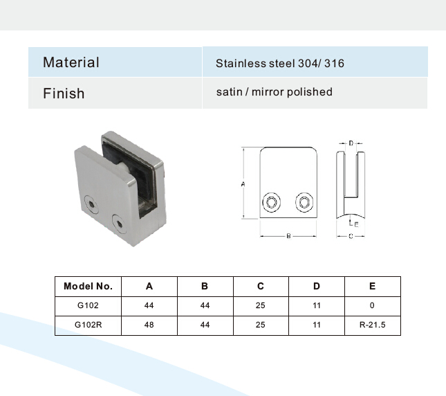 2 morsetto di vetro quadrato in materiale 304SS e 316SS