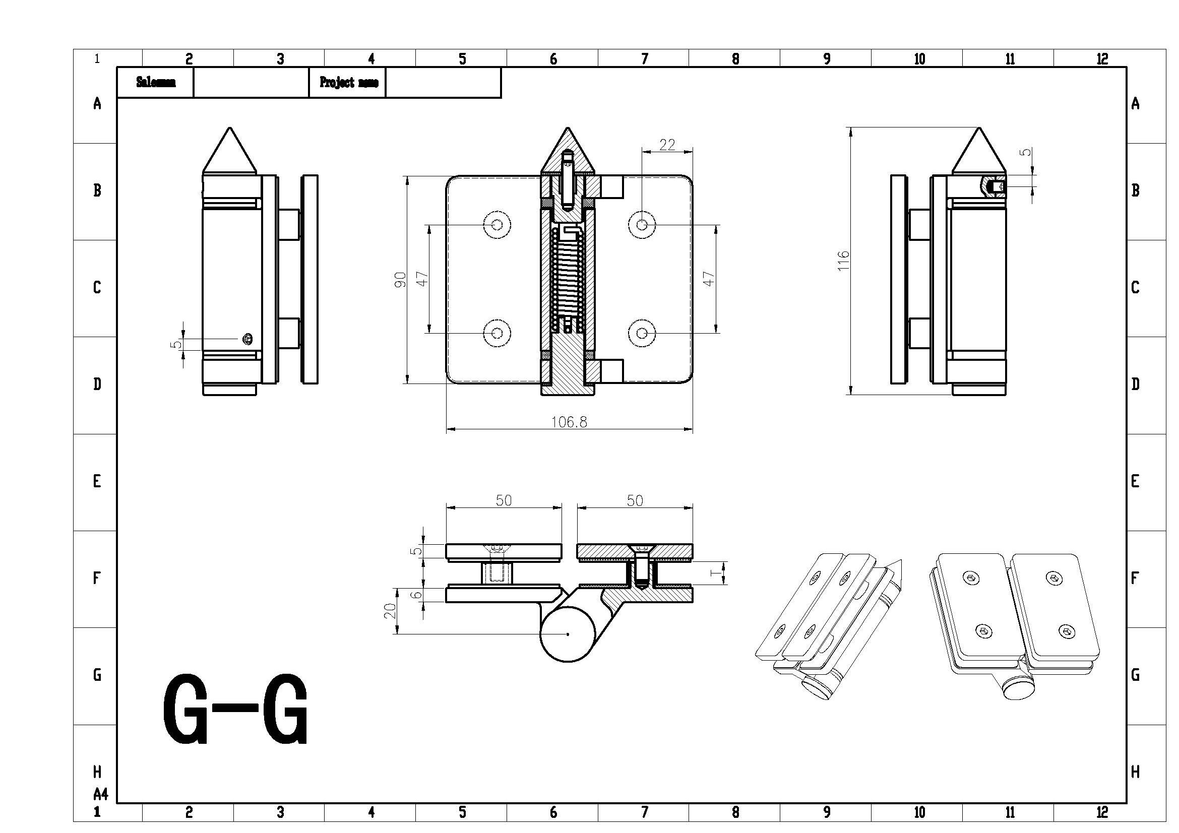 Dimension drawing for G-G Spring-loaded Adjustable 180° Glass-to-Glass Pool Hinge