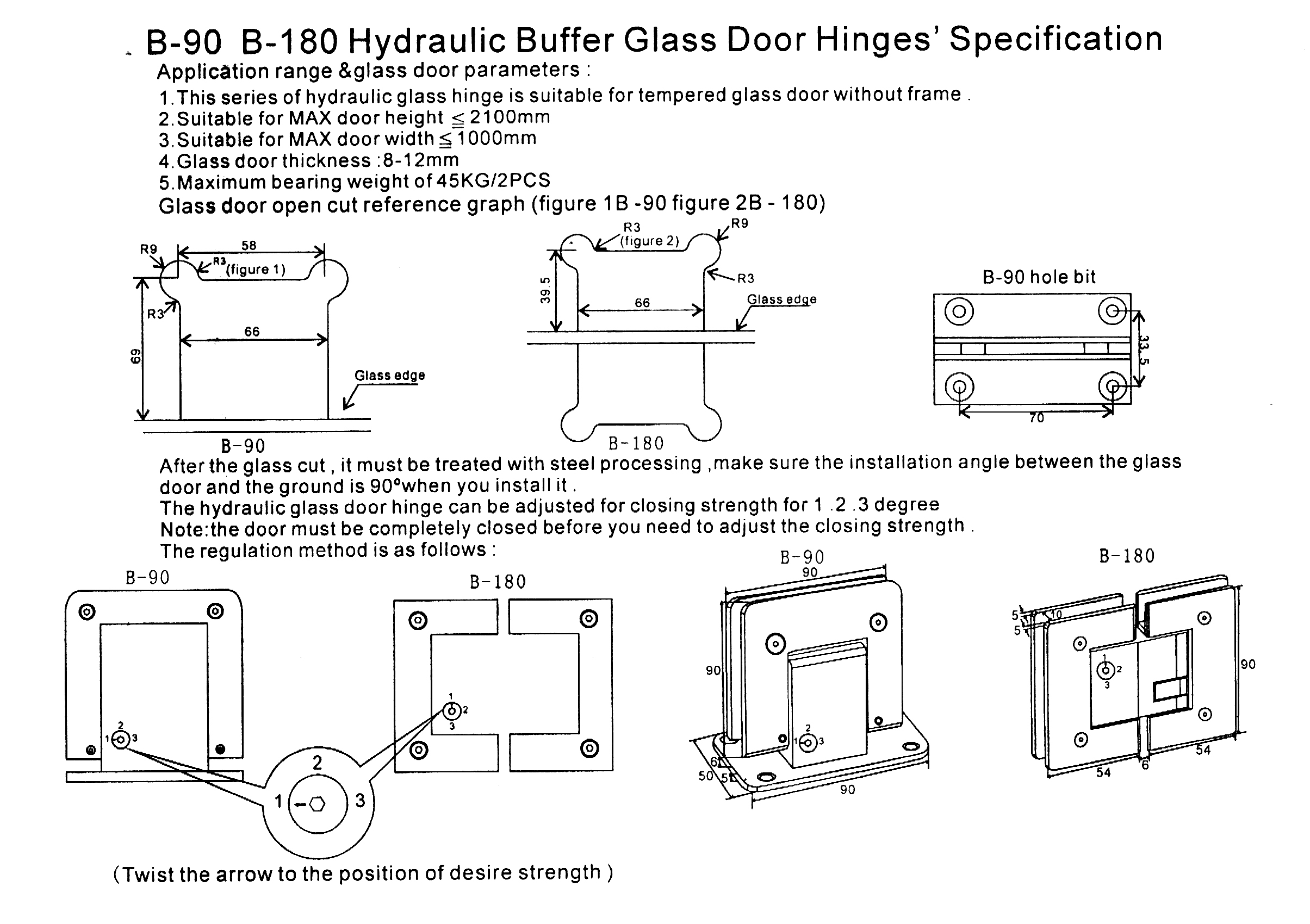| Max. door weight per pair of glass hinge | 45 kgs |